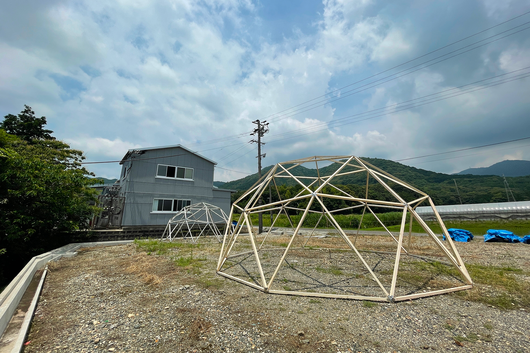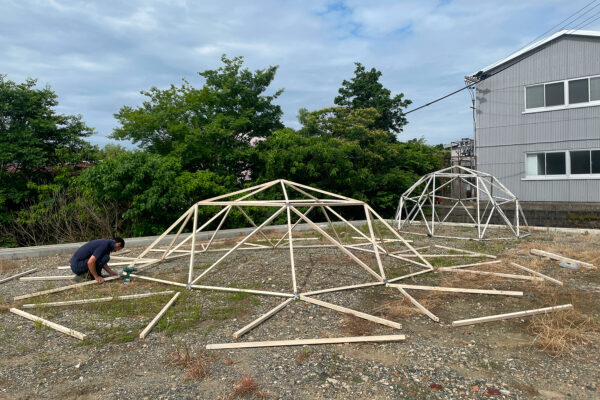 従来のhitode bracketで作るドームよりも面数の多いドームの製作事例。hitode bracketの数量、木材の種類を変えることで作ることができます。既存は40面ですが、75面体にすることで高級感のある特別な空間に。