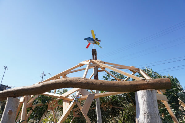 地元の流木や草花で飾り、風見鶏が海風を受けて回ります。2020年新型コロナウイルス拡大の影響を受け予定の屋内施設が閉鎖となり、hitodeドームをメインステージに青空卒業式が行われました。