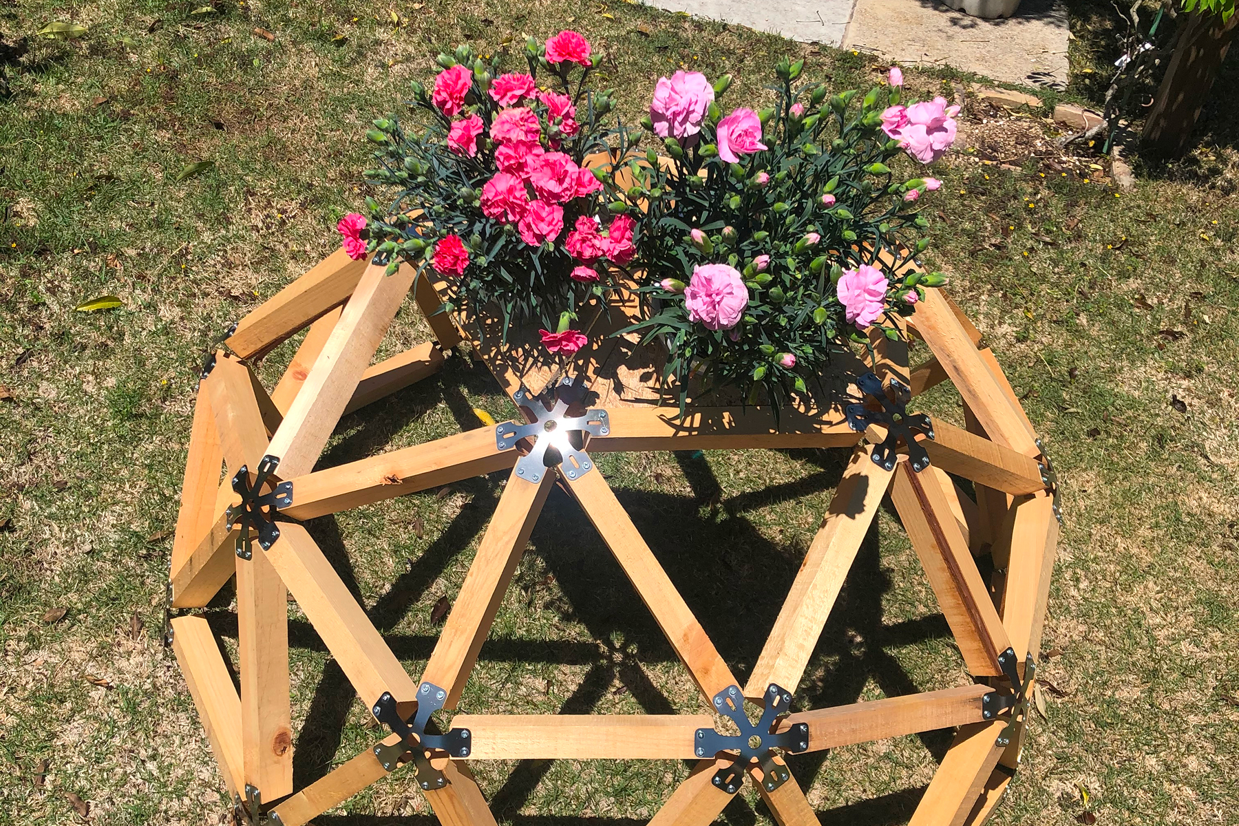 庭のプランタースタンドとしてドームを設置。ドームの三角形に丸穴をあけた板をはめ込み鉢植えを入れると新しいアレンジが完成しました。